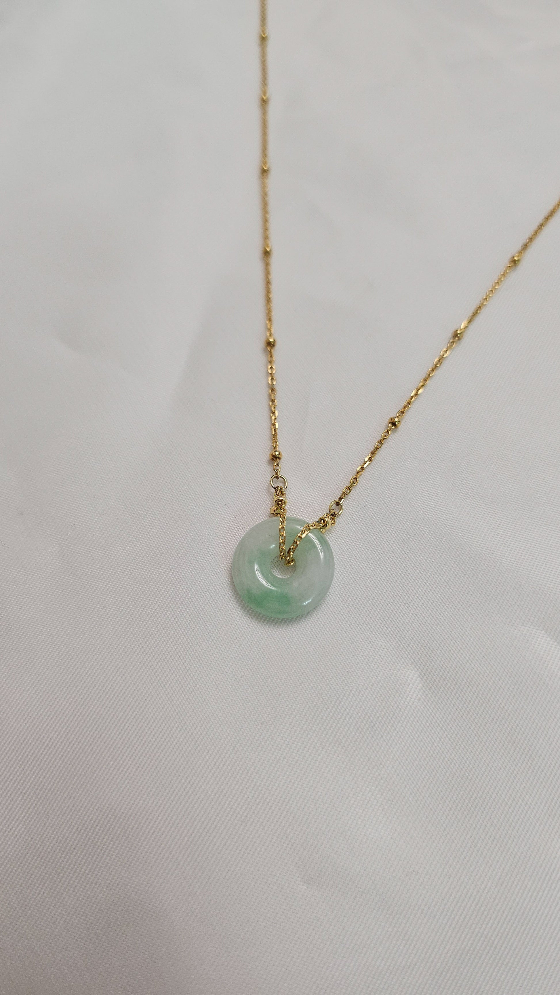 This vintage-style jade donut pendant is the traditional "Ping An Kou" (平安扣), which is a Chinese cultural symbol of safety and protection. Featuring a 13x3mm donut-shaped, pastel green jadeite jade paired with a 18K minimalistic buckle and necklace chain, this pendant is perfect for adding a unique, traditional touch to any outfit.