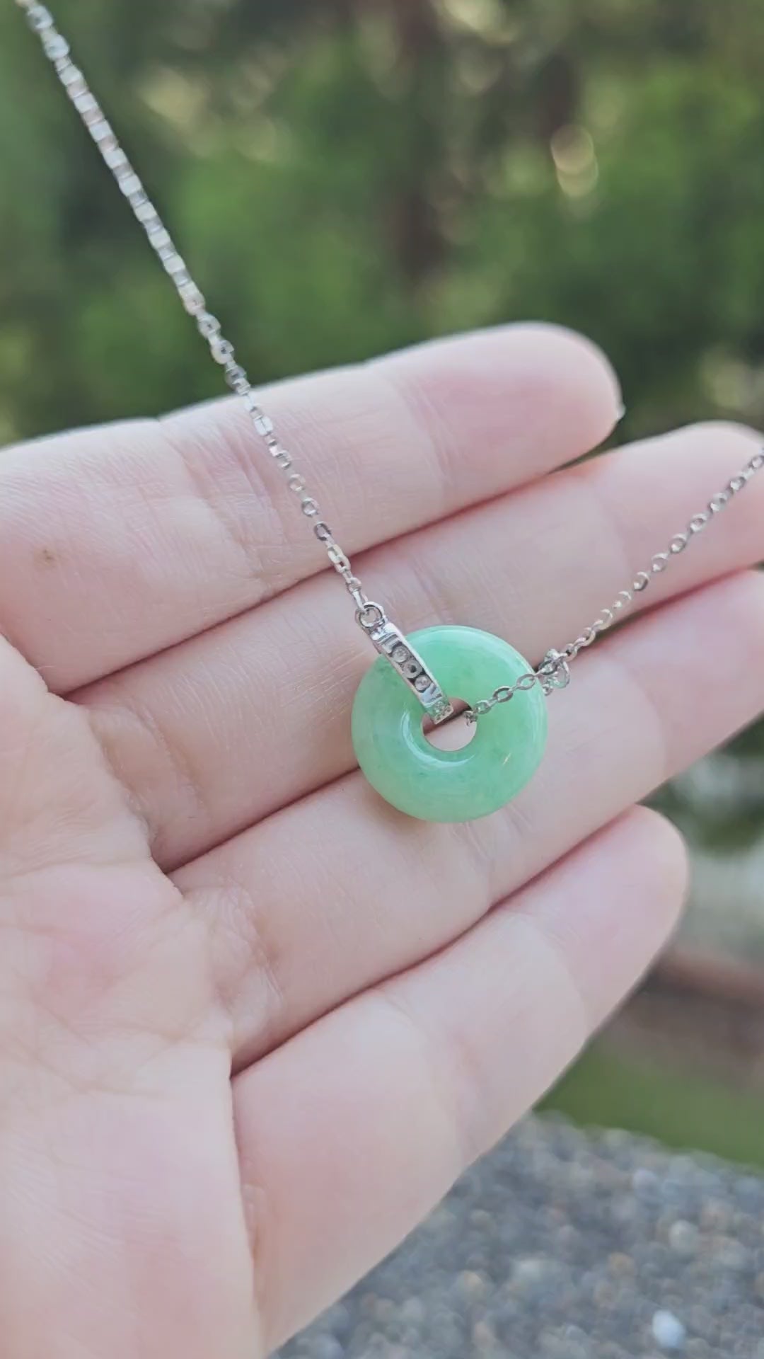 Crafted from premium pastel green jadeite, the smooth, pastel green jadeite disc is delicately suspended from a sleek sterling silver chain, accompanied by a "LOVE" ring with CZ stones, adding a unique twist to the traditional jade pendant.